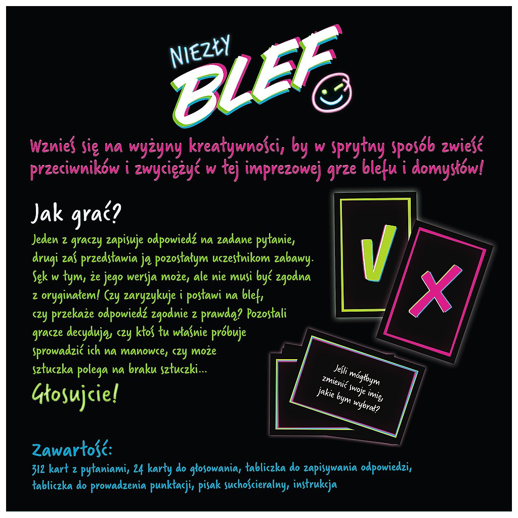 - Trefl Niezły Blef je společenská hra určená pro dospělé a děti od 12 let, která vás vezme na cestu kreativity a osvědčí vaši schopnost blufovat a dedukovat