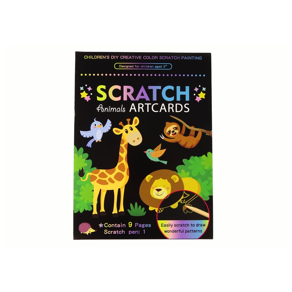 V sadě najdete 9 obrázků k odškrabávání, které ožívají před očima dítěte Hra je jednoduchá: pomocí speciálního dřevěného tyčinky můžete odškrabávat černou vrstvu na obrázku a odhalovat krásné a barevné ilustrace