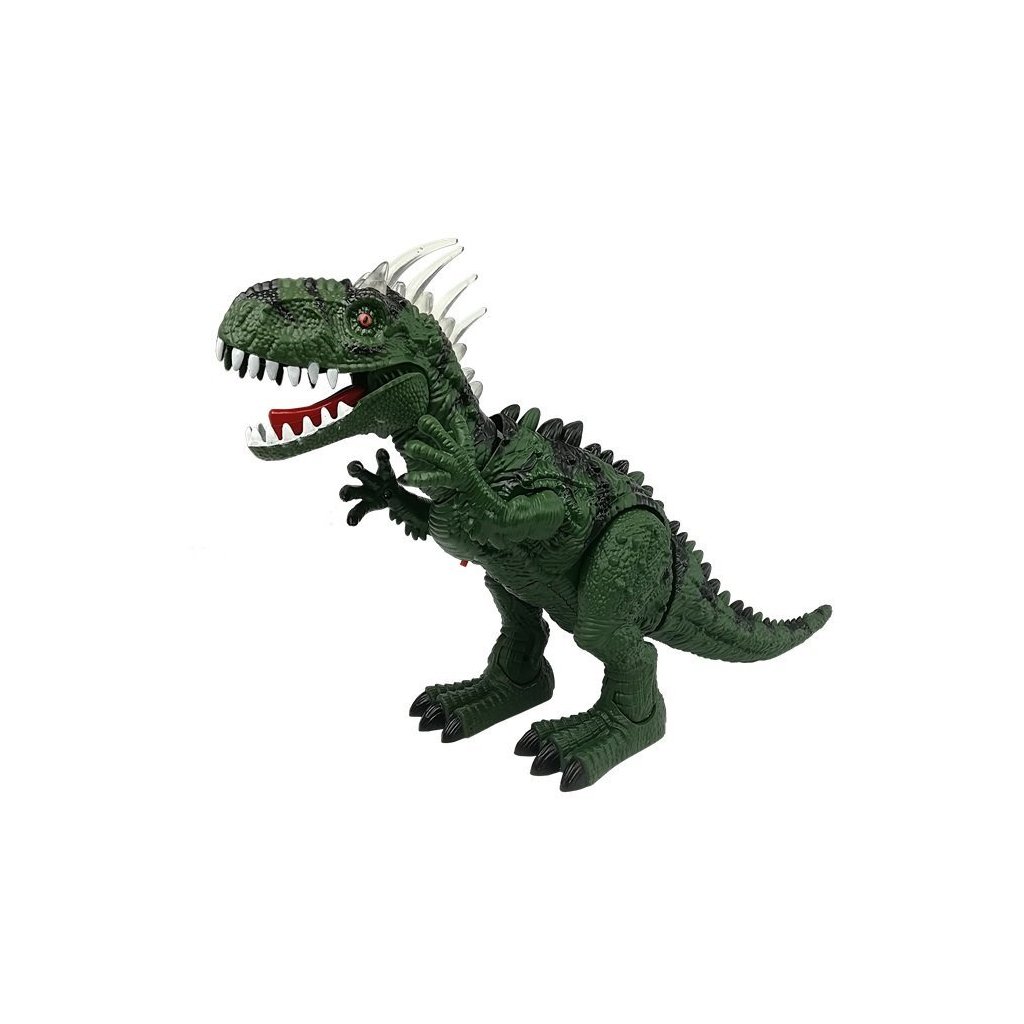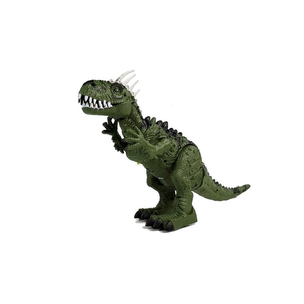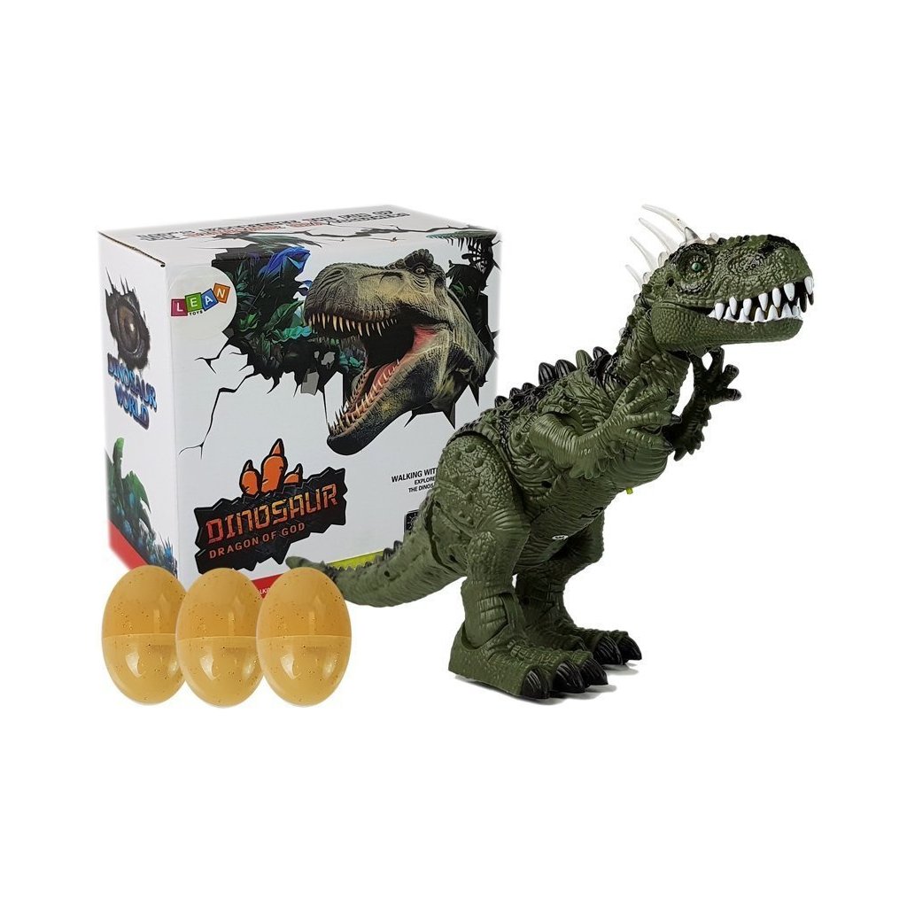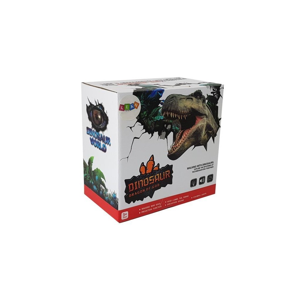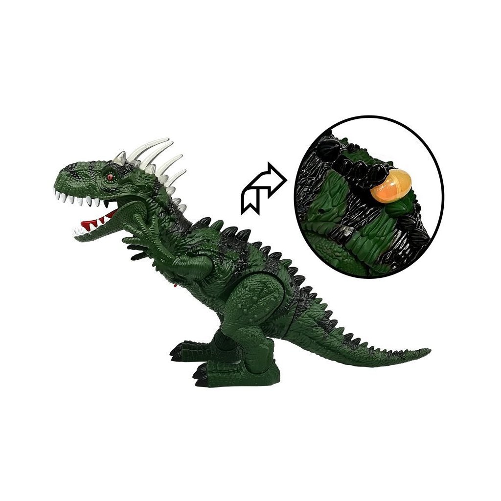 Tyrannosaurus Rex má na temeni hlavy velké šupiny, které svítí různými barvami. Další předností je velká lebka, mohutná, svalnatá stavba těla a velké sněhově bílé zuby. Zelená barva v kombinaci s černými prvky a všemi doplňky, šupinami a dlouhými drápy vyvolávají dojem, že je dinosaurus skutečný! Dinosauří figurka se pohybuje dopředu, hýbe hlavou, předními končetinami, otevírá a zavírá tlamu, vydává řev a pohybuje trupem doprava a doleva. Další výhodou je snášení vajec! Sada obsahuje 3 kusy, které vložíme otvorem na hřbetě a sledujeme, jak jsou vejce při pohybu snášena ze spodní strany. Po zapnutí se na kleci zobrazí fotografie skutečného tyranosaura. Můžeme tak poznat tajemství vzhledu skutečného dinosaura. Je to opravdové dobrodružství pro vaše dítě.