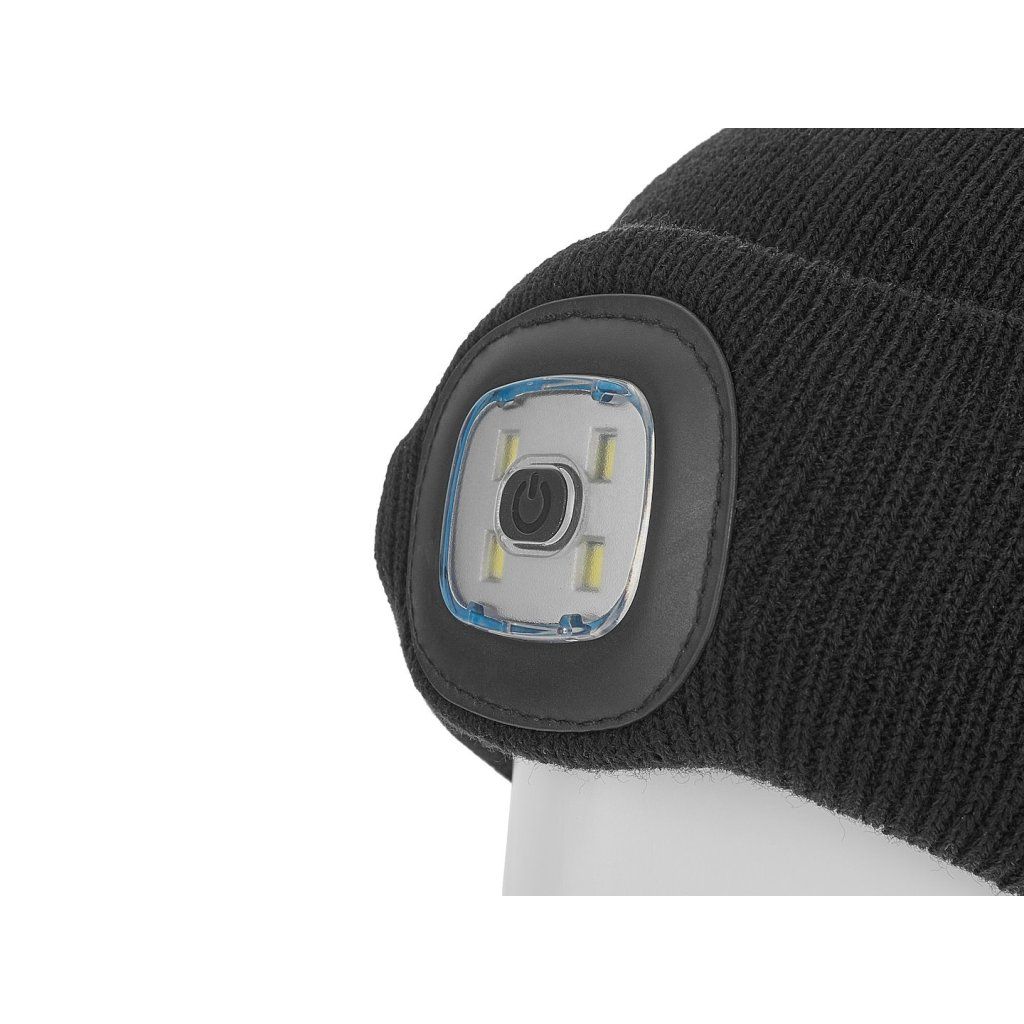 Černá zimní čepice je vybavena LED lampičkou o svítivosti 150 lumenů s vestavěnou baterií. Jedná se o praktické a funkční řešení, ideální pro zimní večery a noci.